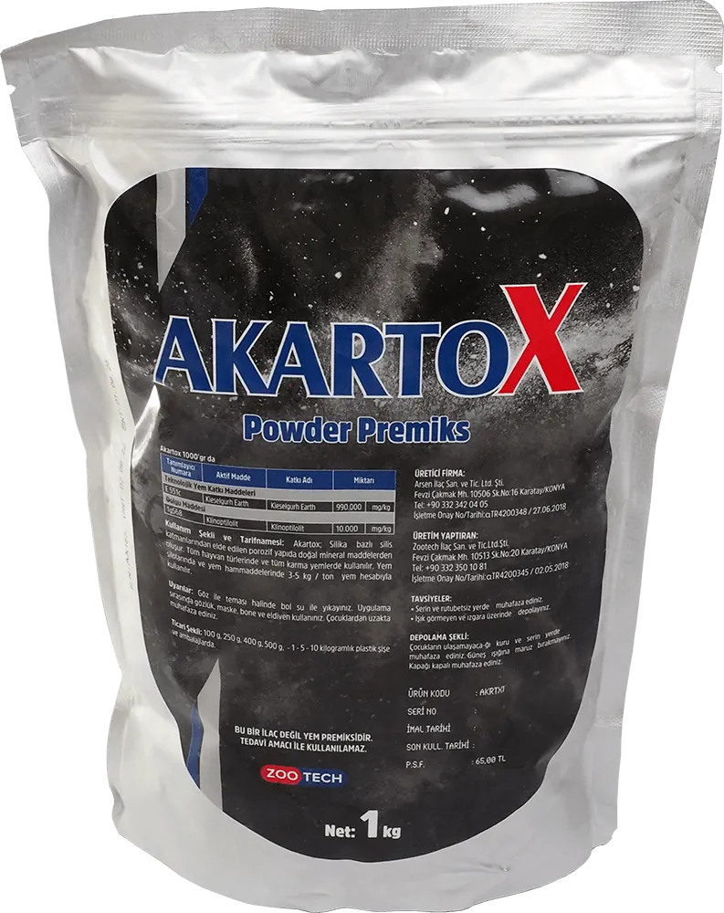 KULLANIM ŞEKLİ VE TARİFNAMESİ: Akartox;Silika bazlı silis katmanlarından elde edilen porozif yapıda doğal mineral maddelerden oluşur. Tüm hayvan türlerinde ve tüm karma yemlerde kullanılır. Yem silolarında ve yem hammaddelerinde 3-5 kg / ton yem hesabıyla kullanılır.